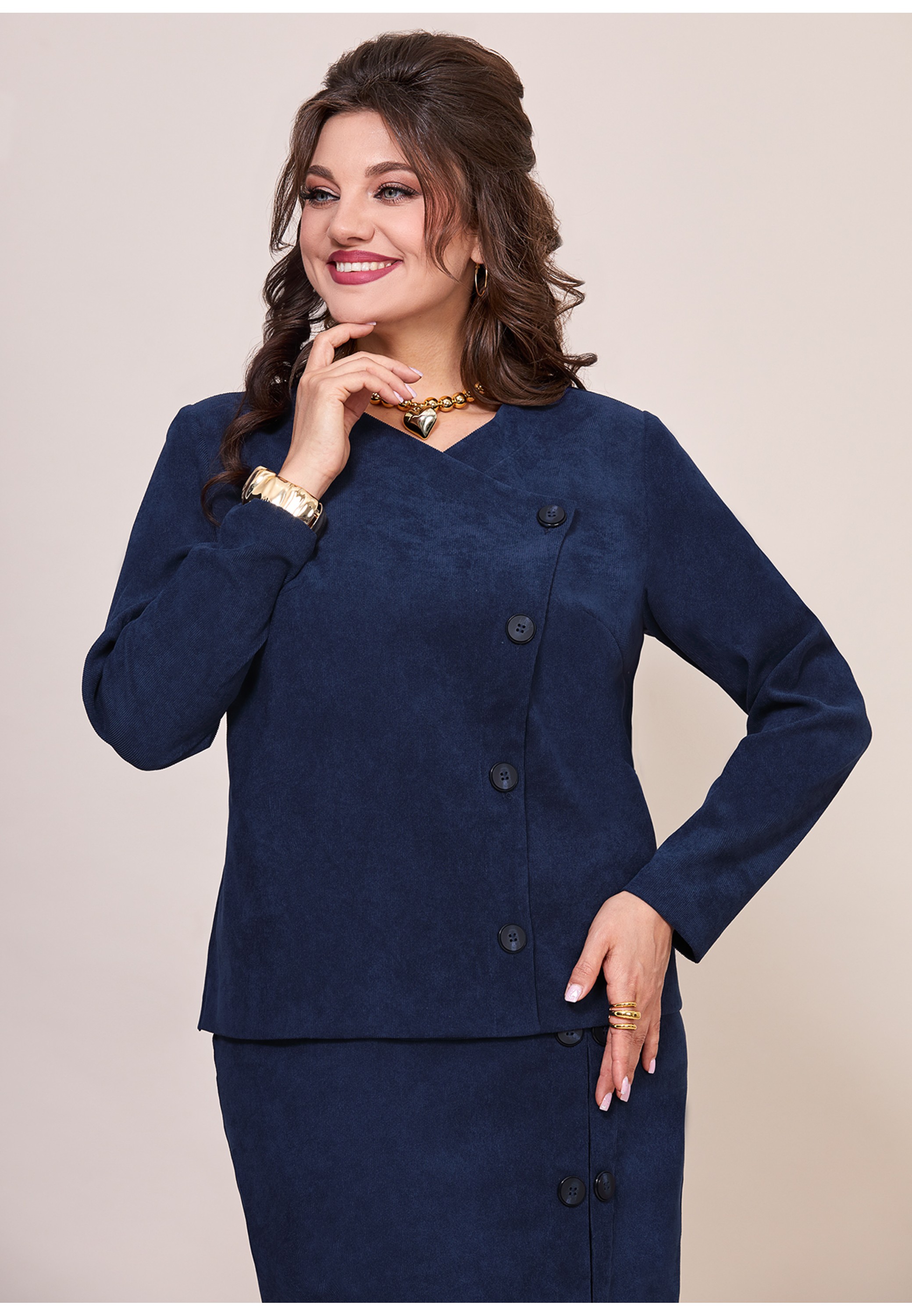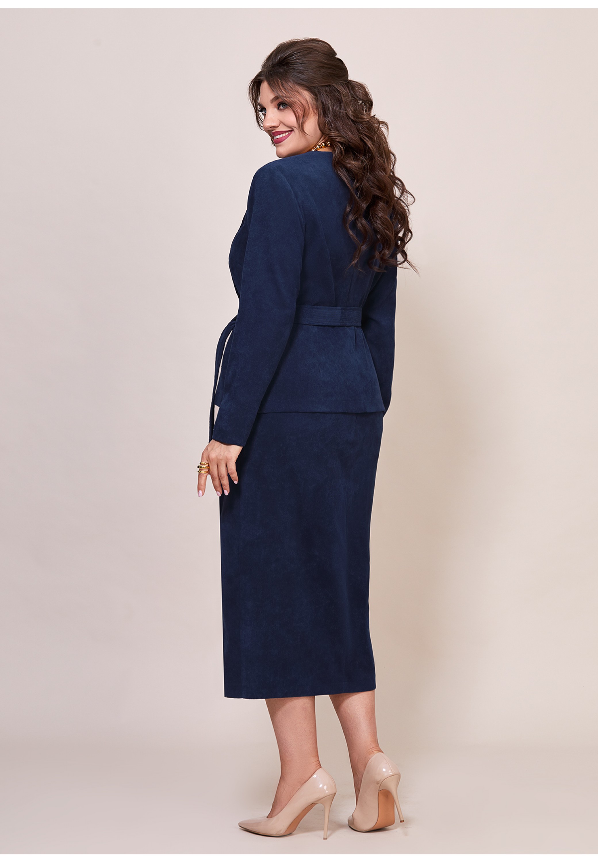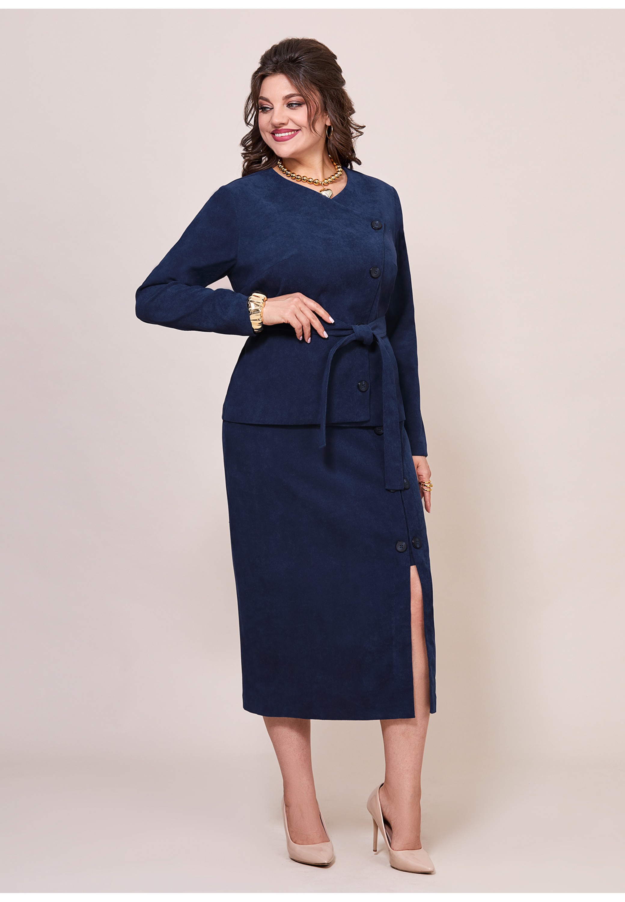 Элегантный, женский костюм полу-прилегающего стиля, выполнен из штрукса, состоит из жакета и юбки. Жакет на подкладке, с ассиметричной застежкой на петли-пуговицы по переду. Также на полочке обработаны вытачки и жакет дополнен съемным поясом из основной ткани. Рукав втачной, длинный, спинка из основной ткани, со средним швом и рельефами. Юбка прямого покроя, из основной ткани, по переду обработан разрез и имитация планок, декорированы пуговицами. Заднее полотнище юбки с вытачками и средним швом, в среднем шве потайная молния, верхний срез обработан притачным поясом. Элегантный костюм отличный выбор для офиса, школы и других учреждений!